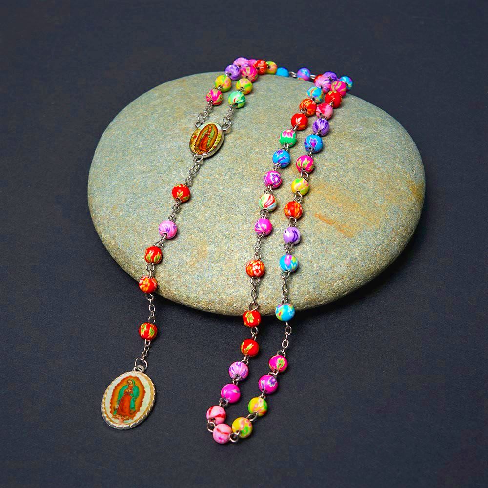 Our Lady of Guadalupe & Crucifix of 6 mm Round Multicolor Polymer Clay Alloy Chain Rosary