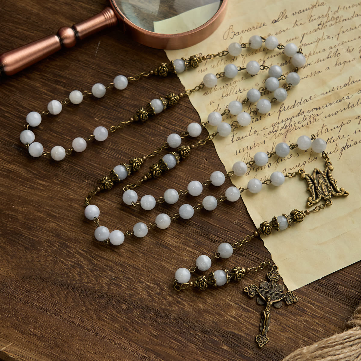 Each white bead on this rosary is a stepping – stone to the divine. Smooth to the touch, they invite you to pause, to breathe, and to enter into prayer. As your fingers glide over them, it’s a physical connection to the sacred, a way to quiet the noise of the world and focus on Christ. These beads are not just objects; they are catalysts for spiritual awakening, helping you open your heart to God’s presence with every count. -
