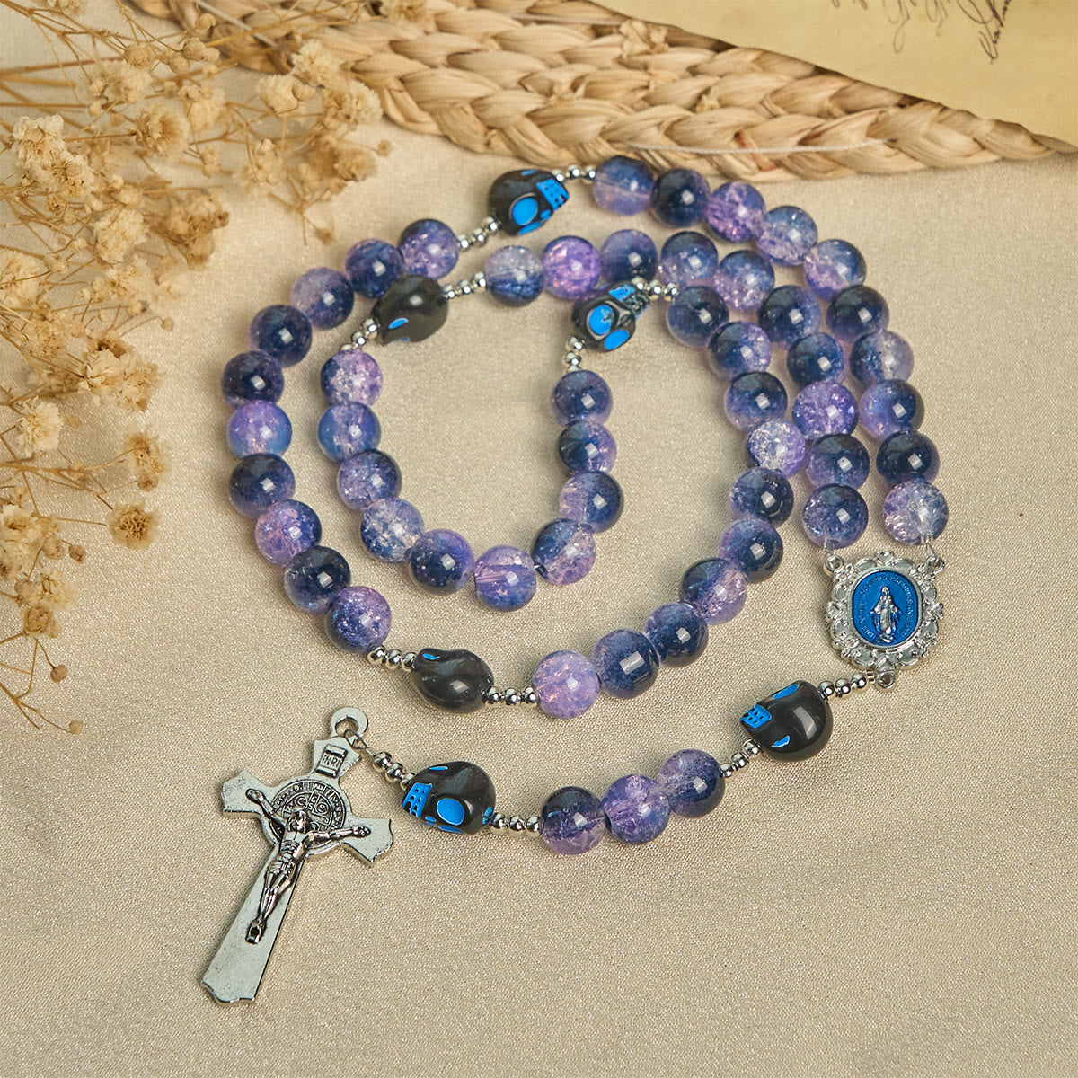 This rosary unites deep purple gemstone-like beads with solemn silver details, creating a devotional piece that reflects faith, memory, and eternal hope. The silver crucifix anchors the rosary in Christ’s sacrifice and salvation, while the skull-shaped beads serve as a poignant memento mori. -