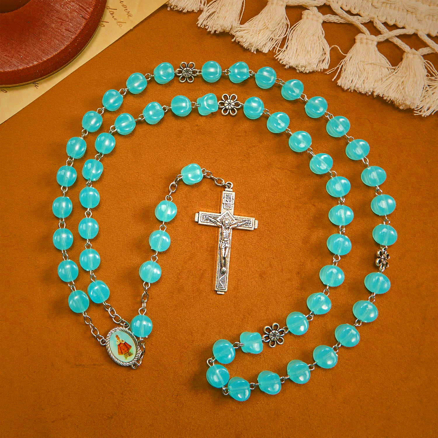 Rose Alloy Chain Blue Cube Beads Rosary with Our Lady Icon & Crucifix: Embrace Divine Elegance