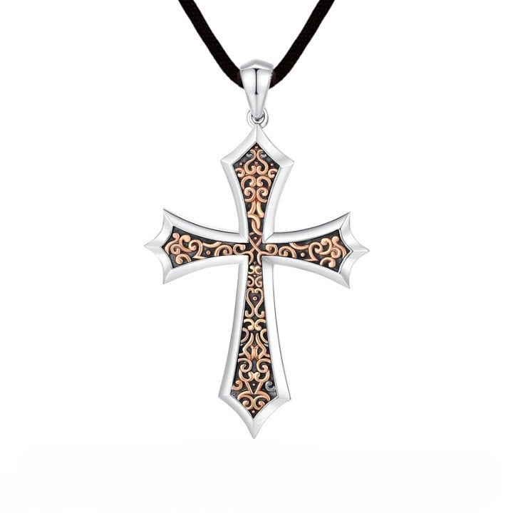 S925 Sharp Edge Cross Necklace with Vintage Amber Baroque Scroll Accents