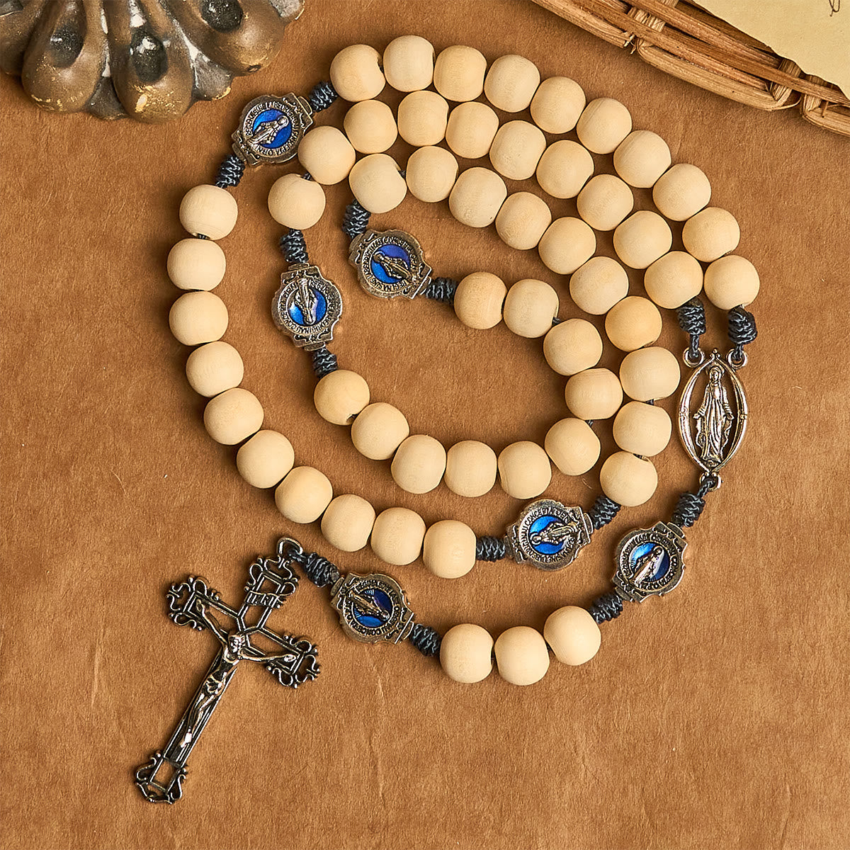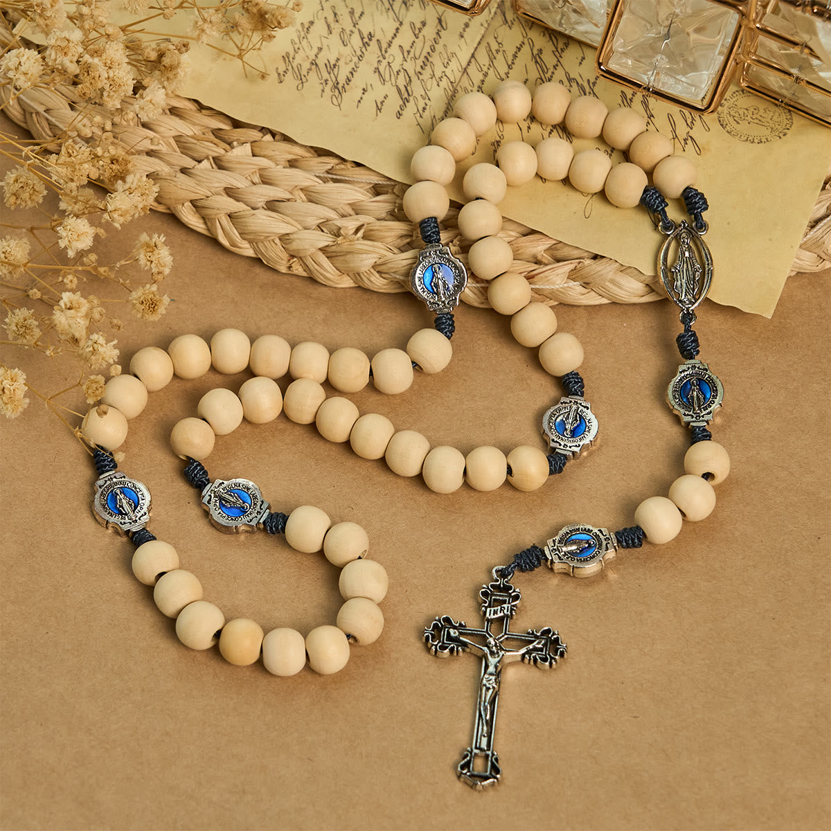This rosary merges nature – inspired wooden serenity with profound spiritual reverence. The intricately crafted crucifix evokes Christ’s enduring love and sacrifice, while the light wooden beads (in soft, natural hues) paired with blue enamel religious icons bring a rustic, timeless allure—making prayer a heartfelt blend of devotion and earthy elegance. -