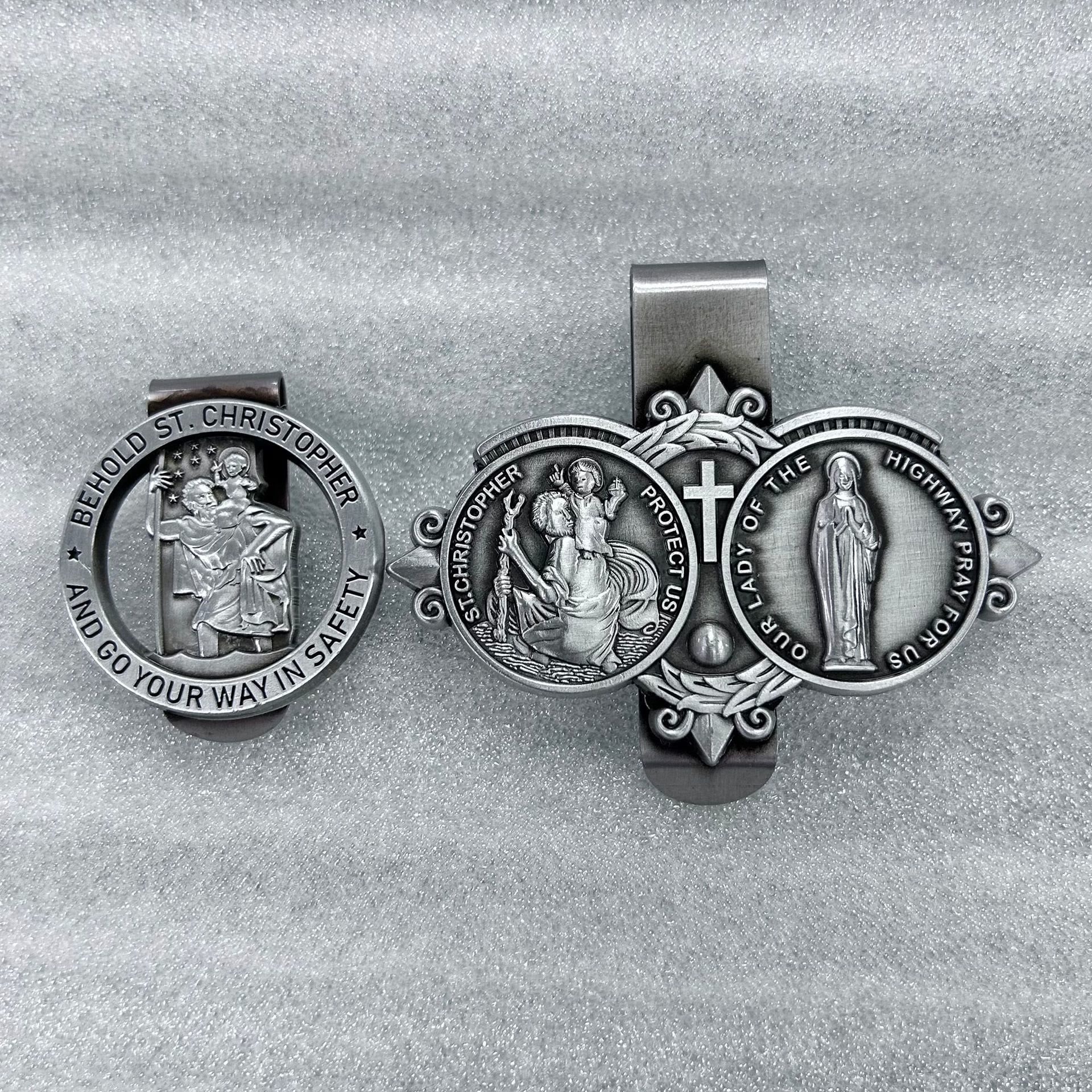 This St. Christopher visor clip features polished metallic craftsmanship and detailed religious imagery, including Our Lady and inscribed prayers. A meaningful devotional accessory for your car, offering spiritual protection on every journey. Perfect for commuters, travelers, and as a thoughtful gift.