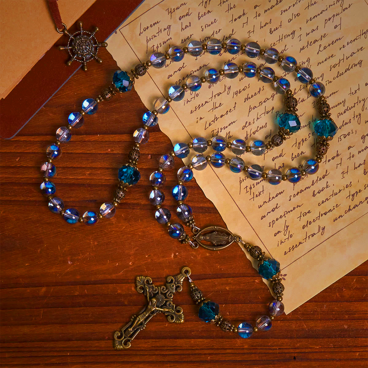 The vivid blue crystals catch light like divine whispers, guiding your prayers. The Miraculous Medal, a symbol of Mary’s love, anchors the rosary in sacred protection. -