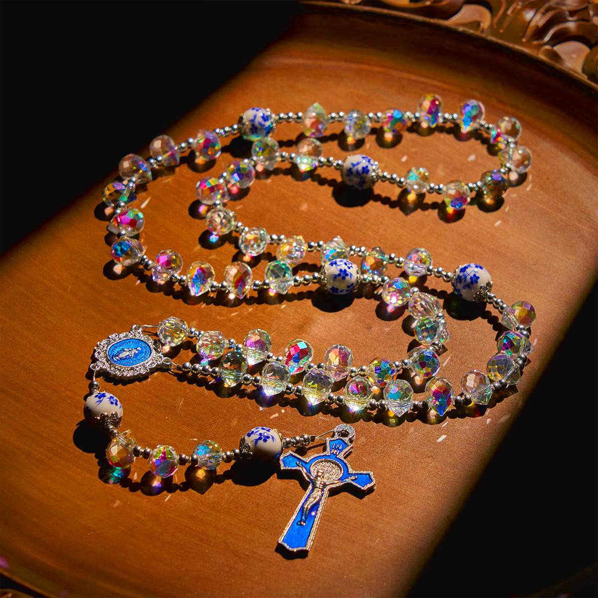 Shining Crystal and Blue Floral Beads Rosary with Enamel Crucifix & Our Lady