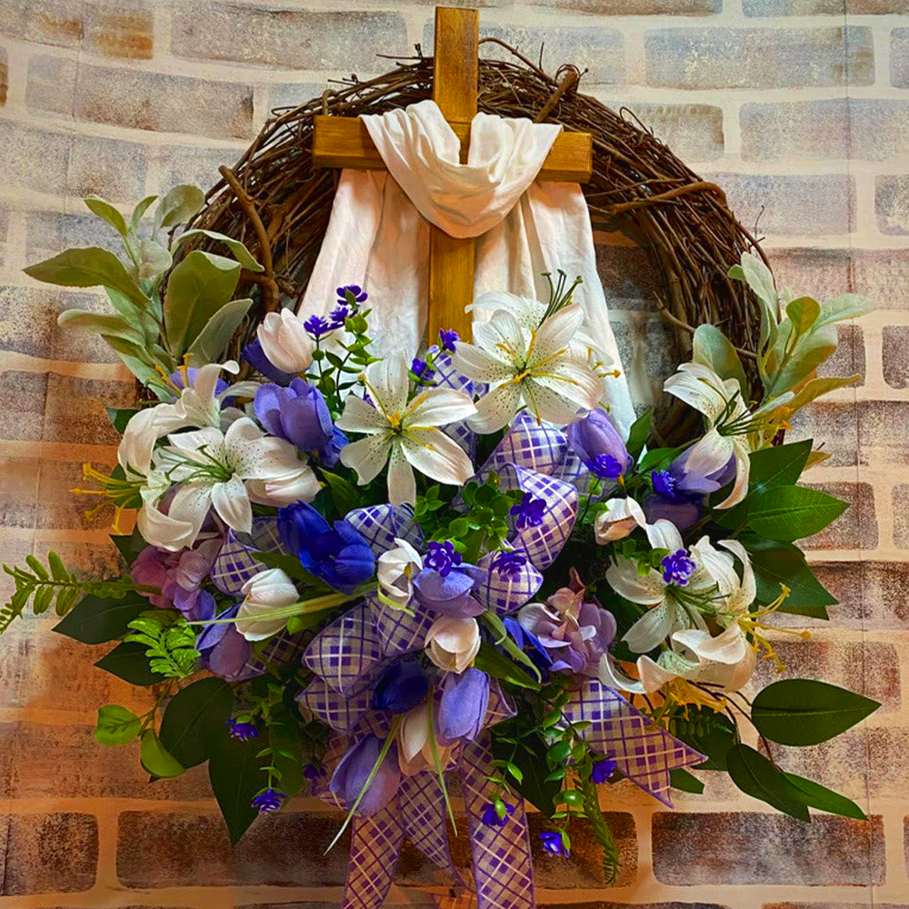 Celebrate faith and spring with this beautifully crafted Cross Wreath. Featuring high-quality artificial flowers, natural wood, and a white silk scarf, it symbolizes Jesus’ sacrifice and resurrection. Perfect for door, wall, or mantel decoration, this wreath brings elegance and spiritual inspiration to any space. Handmade with care, it’s a meaningful gift and daily reminder of hope and renewal.