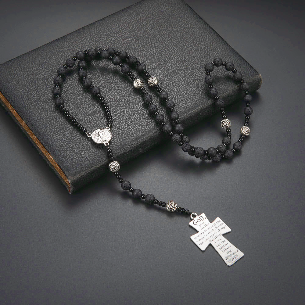 St. Benedict Medal & Cross of 8 mm Round Black Volcanic Stone Nylon Cord Rosary