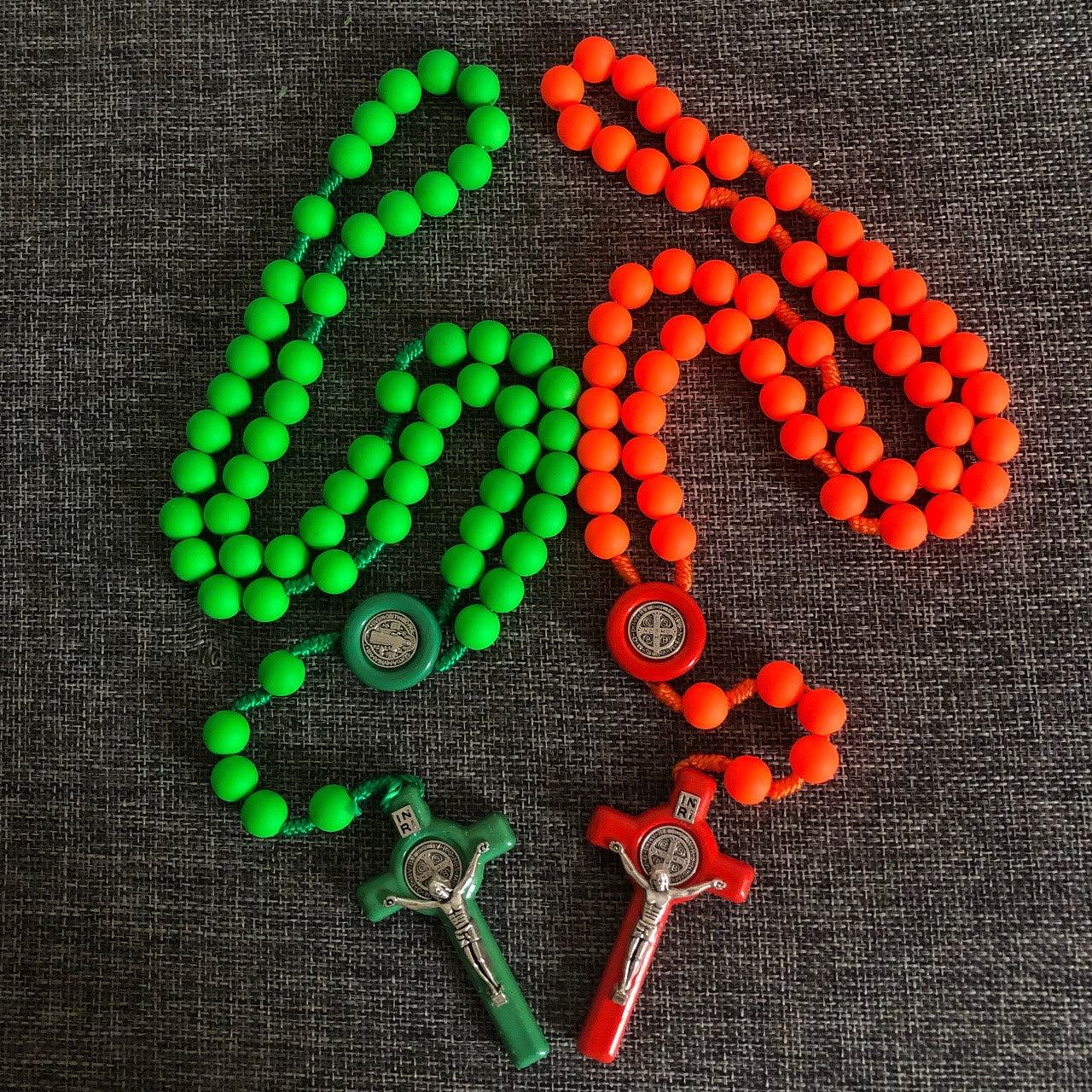 Illuminate your faith with this vibrant fluorescent bead rosary featuring a detailed crucifix and St. Benedict medal. Perfect for nightly prayers, this 10mm round bead rosary glows in the dark, offering a unique spiritual experience. Available in green and orange, it combines style and devotion with high-quality acrylic beads and durable nylon cord. Ideal for personal use or as a meaningful gift.