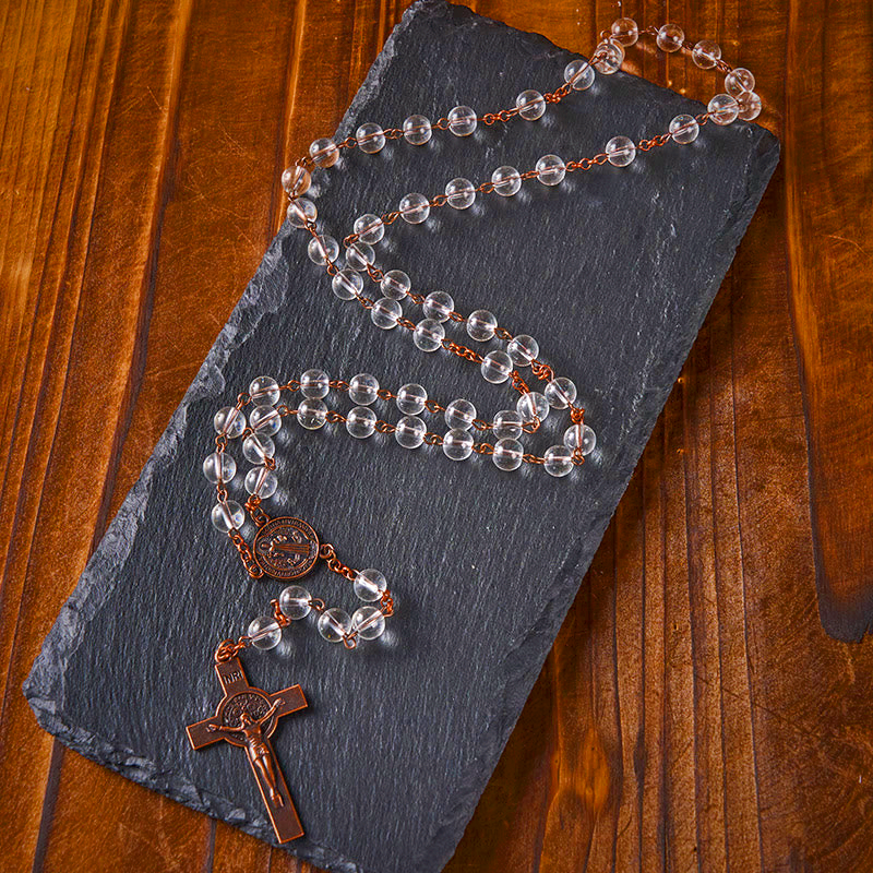 St. Benedict Medal & Crucifix of 8mm Round Clear Glass Alloy Chain Rosary