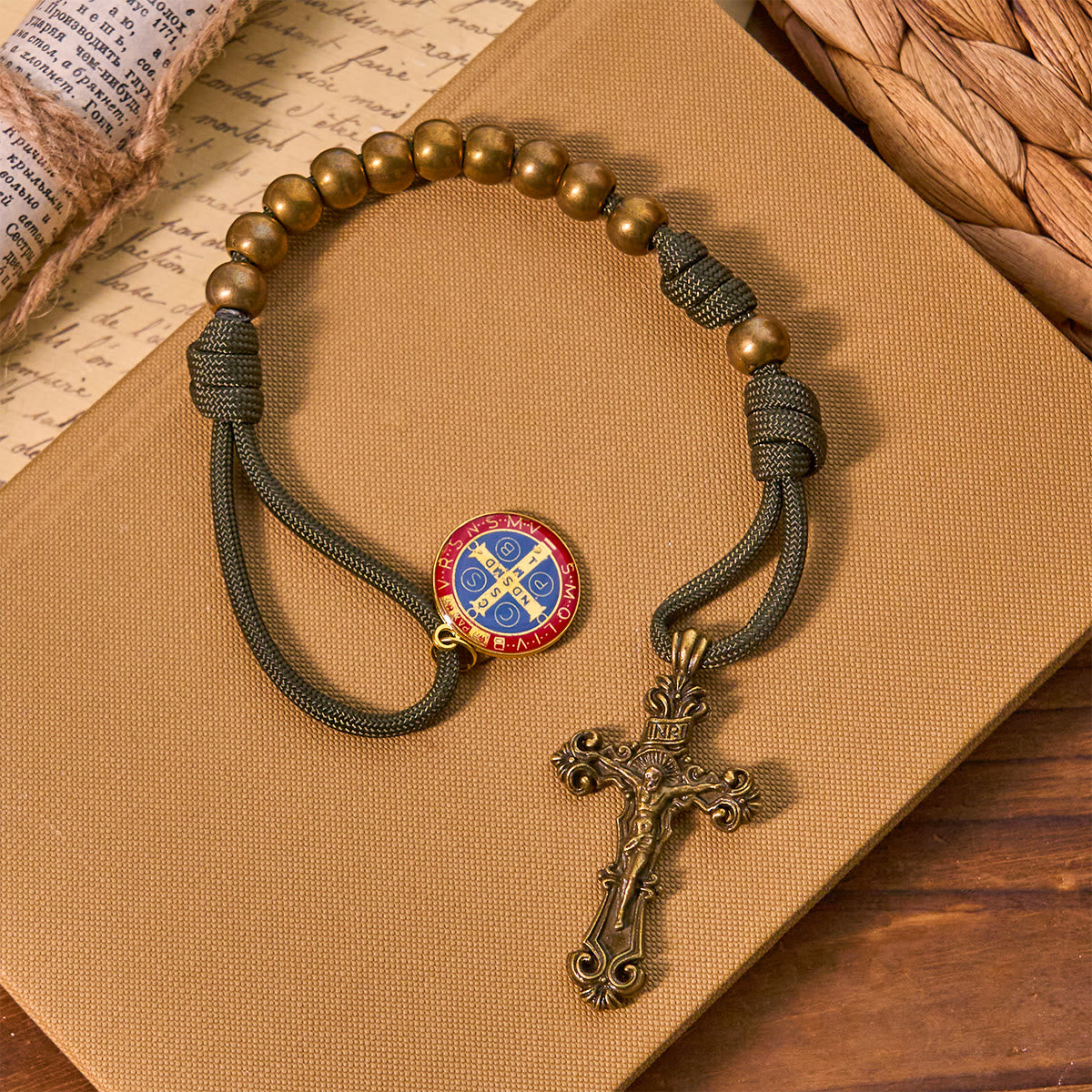 A portable pocket rosary featuring St. Benedict Medal and Crucifix for spiritual protection. Made with bronze beads and durable nylon cord, perfect for daily carry and prayer.