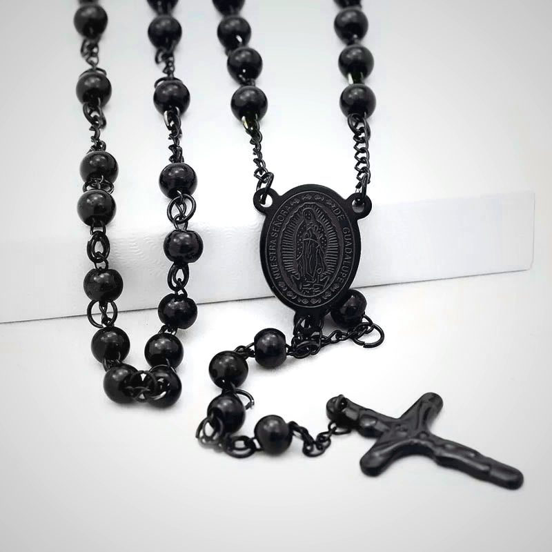 This handmade stainless steel black beaded rosary features 4mm beads, weighs about 80g, and is crafted with care for durability and faith. Perfect for prayer and devotion, it includes a Virgin Mary and St. Benedict design. Backed by a quality guarantee, safe payment options, and fast shipping.