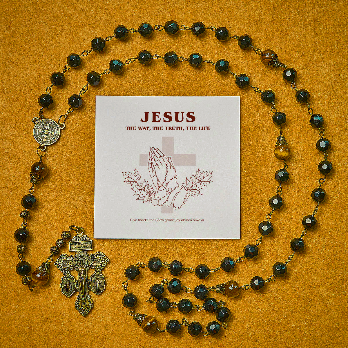 • This Thanksgiving, express your deepest gratitude and blessings with the Natural Stone Guardian Rosary—8mm obsidian carries the message of gratitude for God’s safe protection, while natural tiger’s eye embodies gratitude for the strength of faith. Paired with the Cross of Absolution and the Order of St. Benedict, these beads convey the profoundest gratitude and blessings this Thanksgiving. Whether you’re giving them to friends and family facing challenges, elders steadfast in their faith, or yourself in need of spiritual support, they imbue your gratitude with the tangible texture of natural stone and the sacred meaning of protection, making them a unique Thanksgiving gift that celebrates protection and strengthens faith.