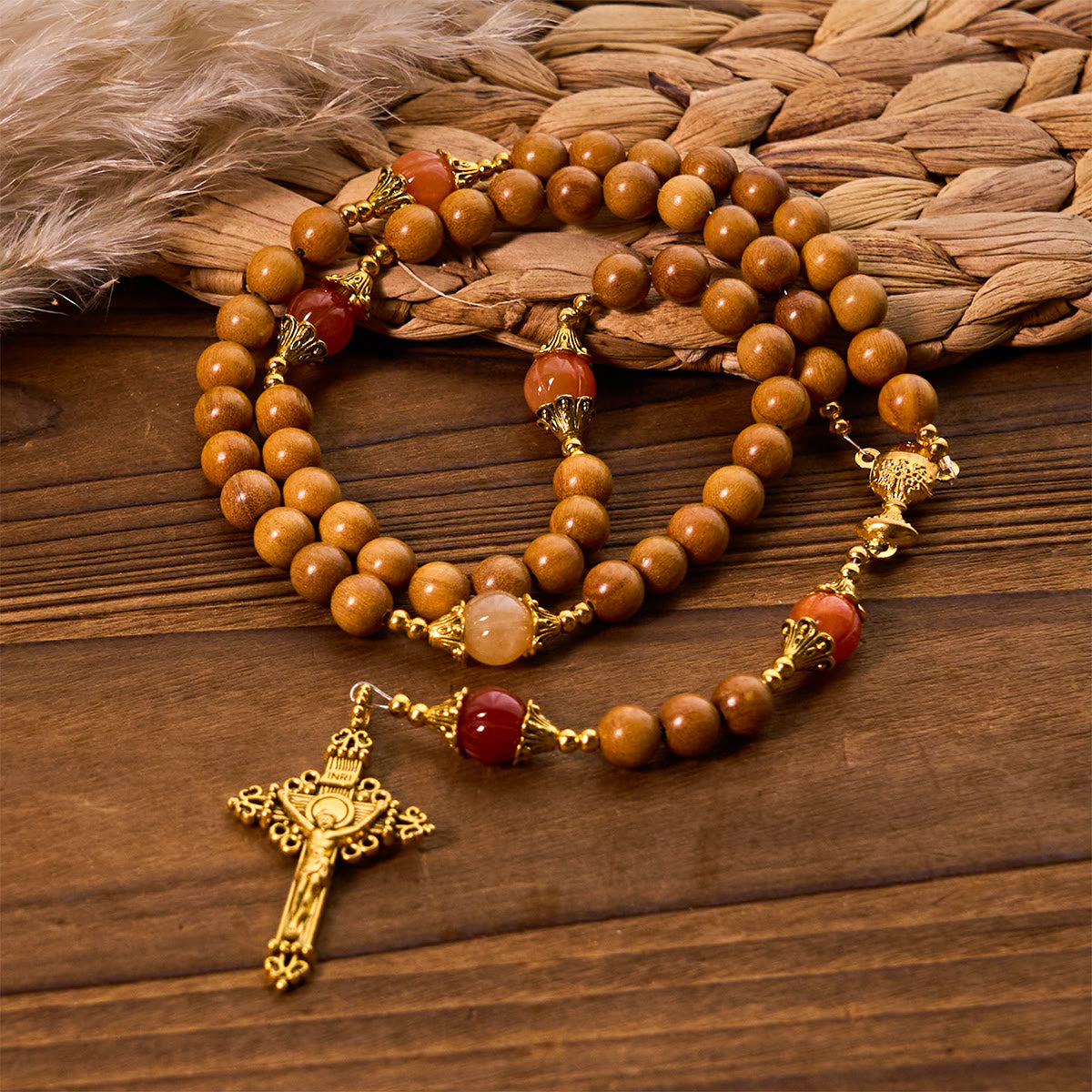 Celebrate gratitude and faith with this Thanksgiving Sandalwood Rosary. Featuring golden pumpkin gemstones, a Holy Grail, and Crucifix, it blends autumn warmth with spiritual devotion. Ideal for prayer or seasonal decor.