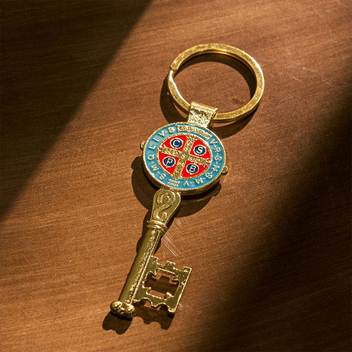 Classic Golden Edged St. Benedict Keychain with Intricate Patterns: Timeless Symbol of Spiritual Devotion