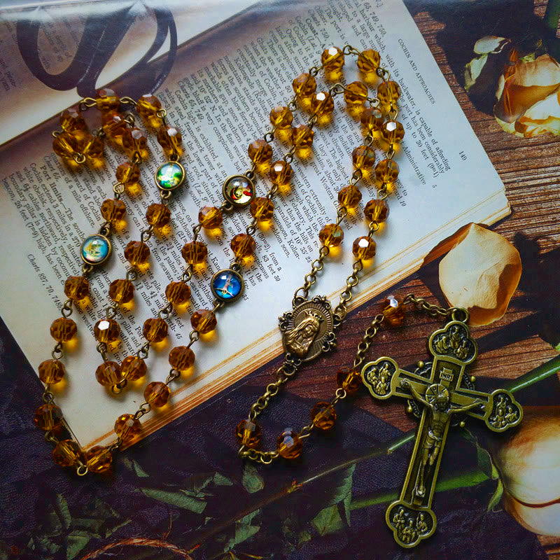 Enchanting Yellow Glass Beads: Each bead in this rosary is crafted from polyhedron yellow glass, reflecting light with a captivating sparkle. The unique polyhedron cut enhances the natural brilliance of the glass, infusing your prayers with a sense of warmth and light.